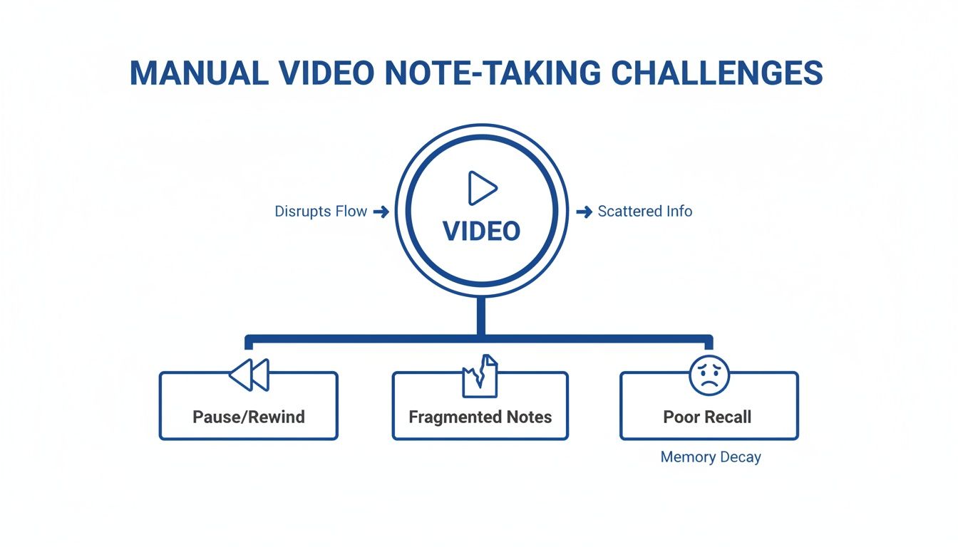Taking notes by hand while watching a video is a clunky process that constantly pulls you out of your learning flow. This isn't a personal failure; it's a conflict between a dynamic medium (video) and a static note-taking method. The entire process is full of friction that hinders learning.