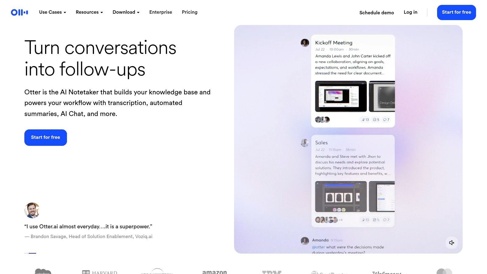 The official Otter.ai homepage focuses on its core use case: AI notes for business meetings. It highlights features like automated summaries and AI Chat for meetings. It’s a good place to sign up for the free Basic plan to test the transcription quality.