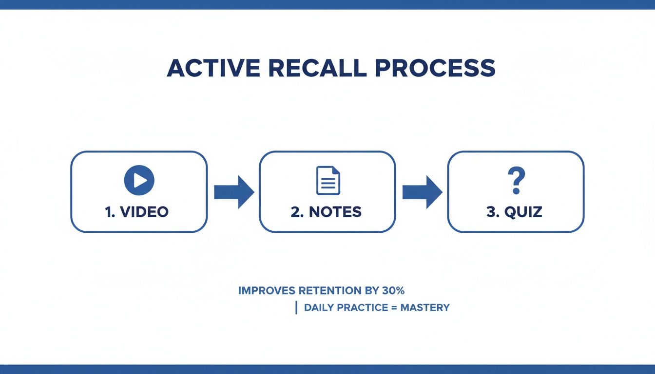 Active recall forces your brain to pull information out of storage rather than just passively recognizing it on the screen. Think of it this way: re-watching a lecture is like walking down a familiar path. Active recall is like being dropped in the nearby woods and having to find that path on your own. It's harder, but it strengthens your mental map like nothing else.