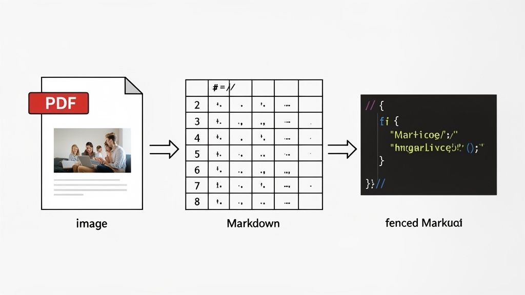 For Images: Your best bet is a two-step process. First, use a PDF tool to extract all images into a separate folder. Then, as you clean up the Markdown file, link to them with the standard `` syntax. This is similar to how you might capture and organize visuals from a video, a process we cover in our guide on how to screen capture from YouTube.