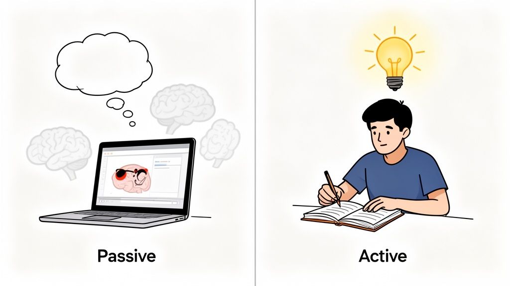 This is where active learning strategies come in. Research shows that retrieval practice—actively trying to recall information—can lead to 20–40 percentage points higher recall on delayed tests compared to just passively re-watching. That's the difference between knowing a subject and just recognizing it. The goal is to find a system that makes this active interaction happen without the hassle. For more on this, you can explore our guide on how to study effectively for exams.