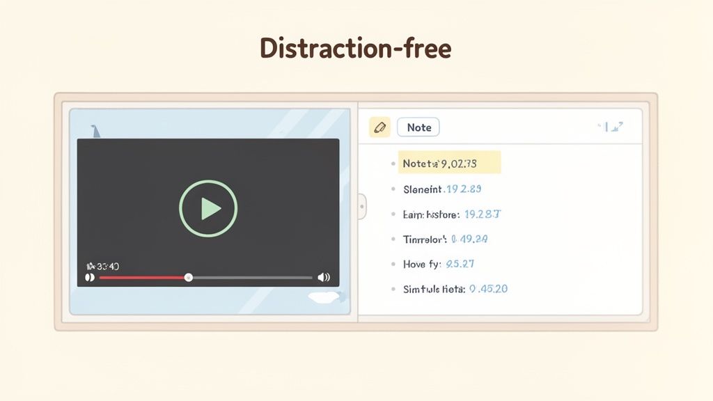 A truly effective workflow kills the pause-play-rewind cycle. It creates a single, focused environment where the content and your notes live side-by-side.