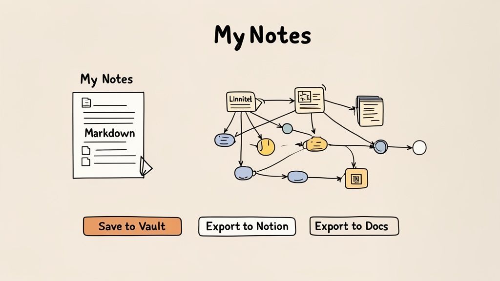 When your notes are saved as local-first Markdown (.md) files, they belong to you. They aren’t trapped in a proprietary cloud service. For anyone serious about building a lasting knowledge base, this local-first storage is a key advantage. You own the files—move them, back them up, search them. They're just Markdown.