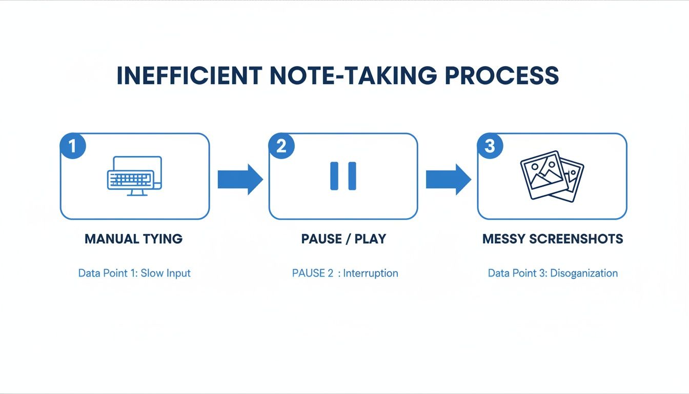 Unlike tools that only parse transcripts, some modern tools watch the video to capture what's actually on screen. This problem isn't unique to Bilibili; we cover the same issue in our guide to getting a transcript from a YouTube video. Manual methods force a choice: pay attention to the video or take notes. You can't do both effectively.