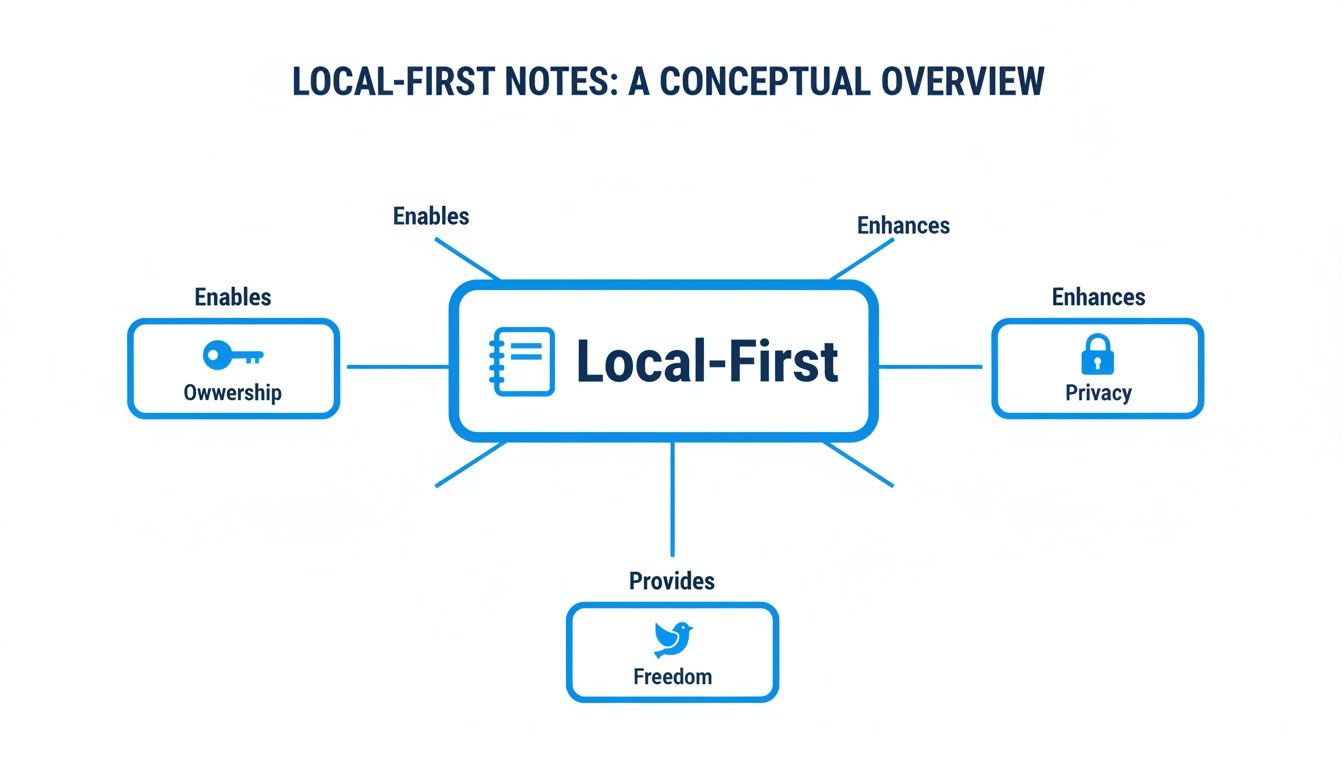 The central idea is empowerment. It frees your knowledge from corporate servers and gives you total ownership and privacy. It's no surprise that many of the best note-taking apps for students now embrace this model, because they recognize that modern learners demand control. This approach is fundamental for anyone serious about building a personal knowledge base that lasts a lifetime.