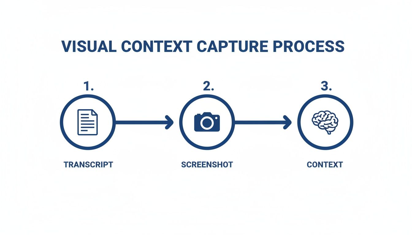 For a technical tutorial, a text transcript alone is almost useless. You need to see the code, the UI, or the diagram. Targeted screen captures are essential.